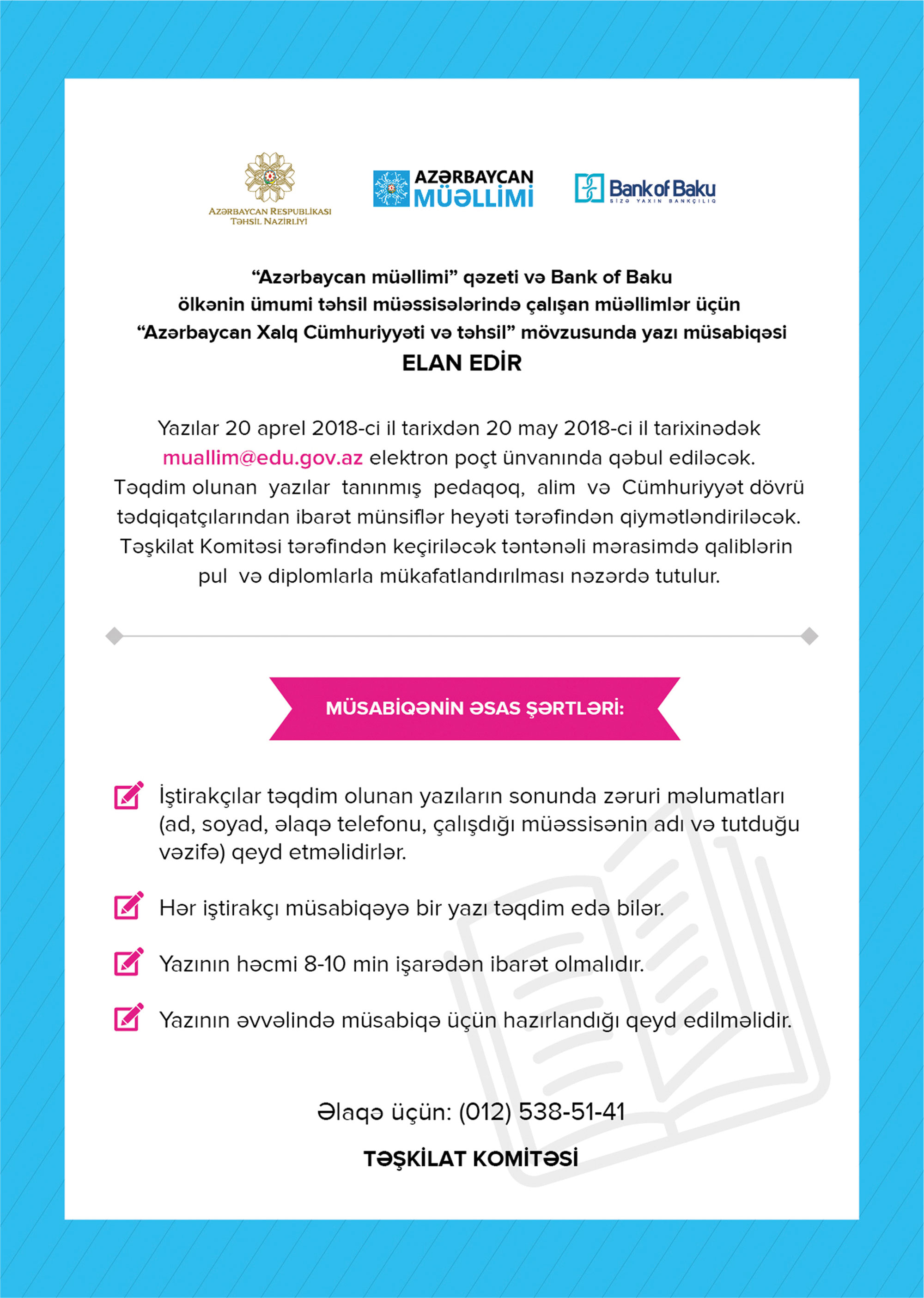 Yazılar 20 aprel 2018-ci il tarixindən 20 may 2018-ci il tarixinədək muallim@edu.gov.az elektron poçt ünvanına göndərilməlidir.
