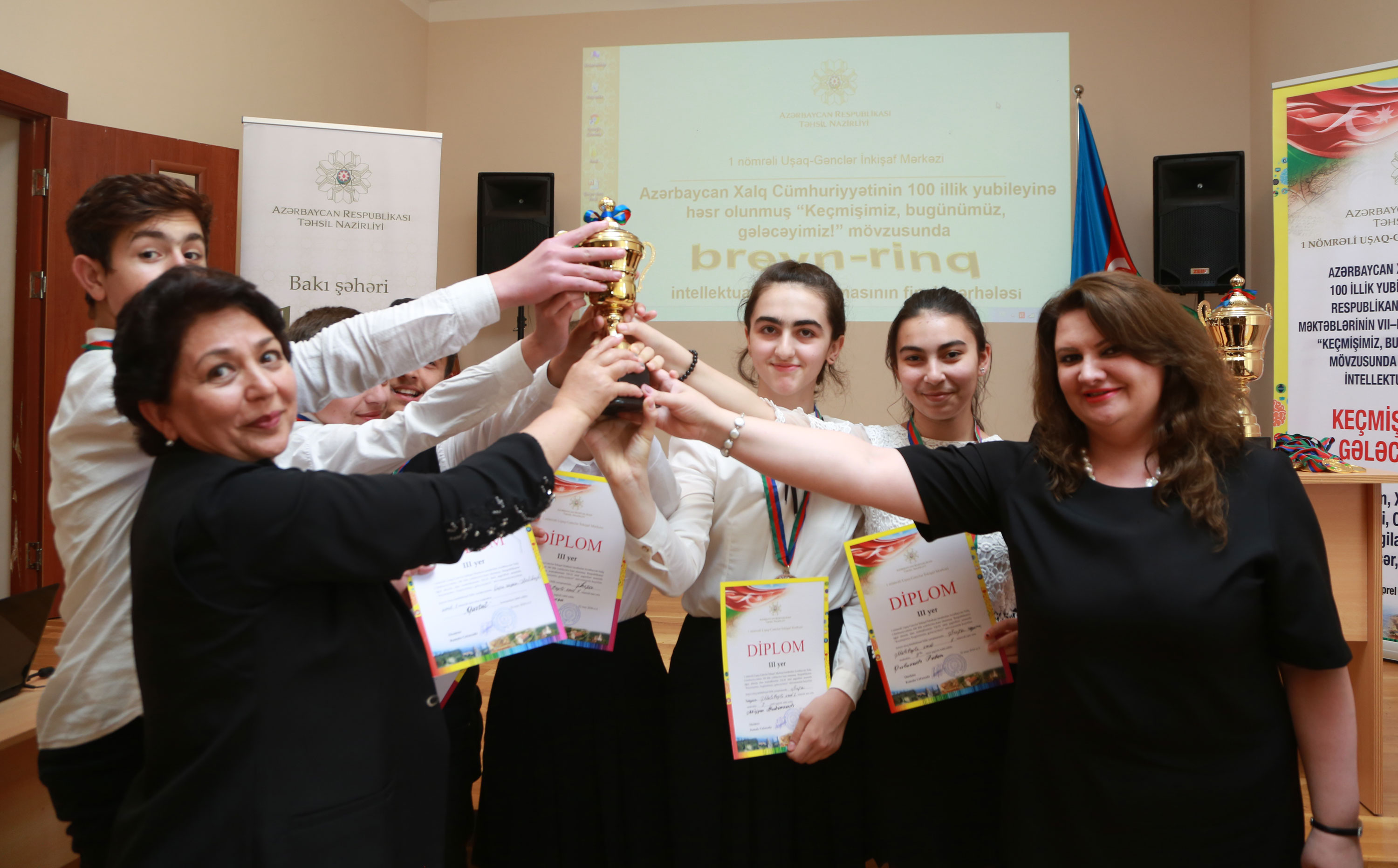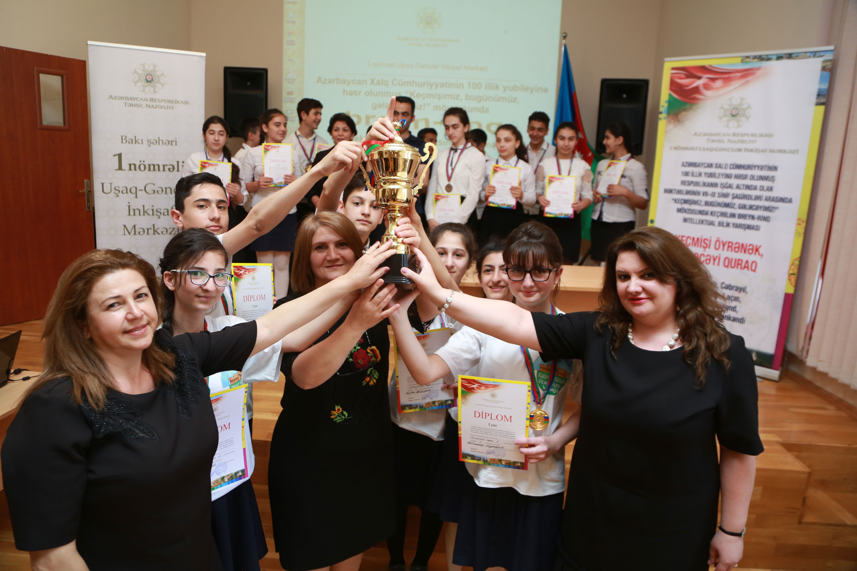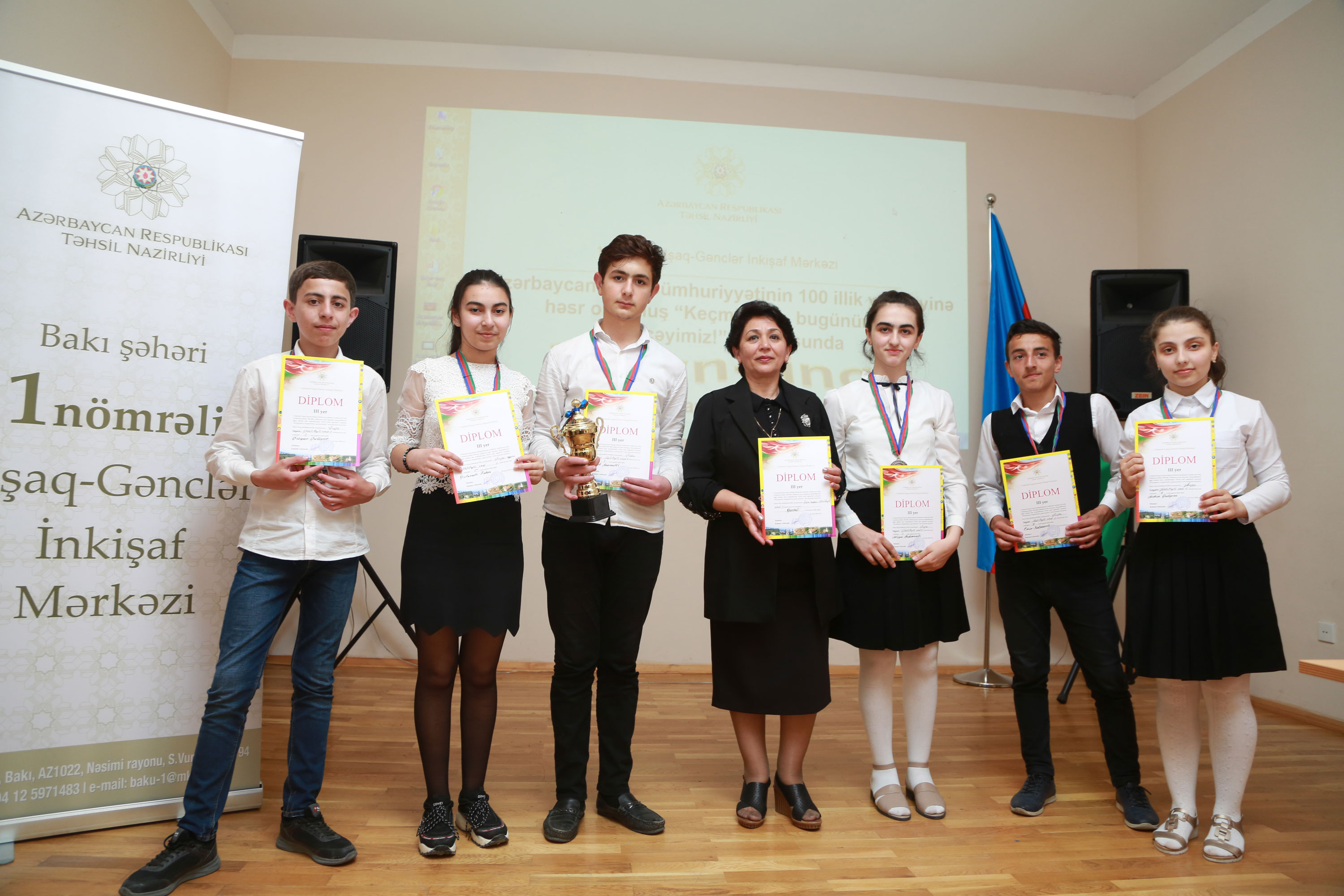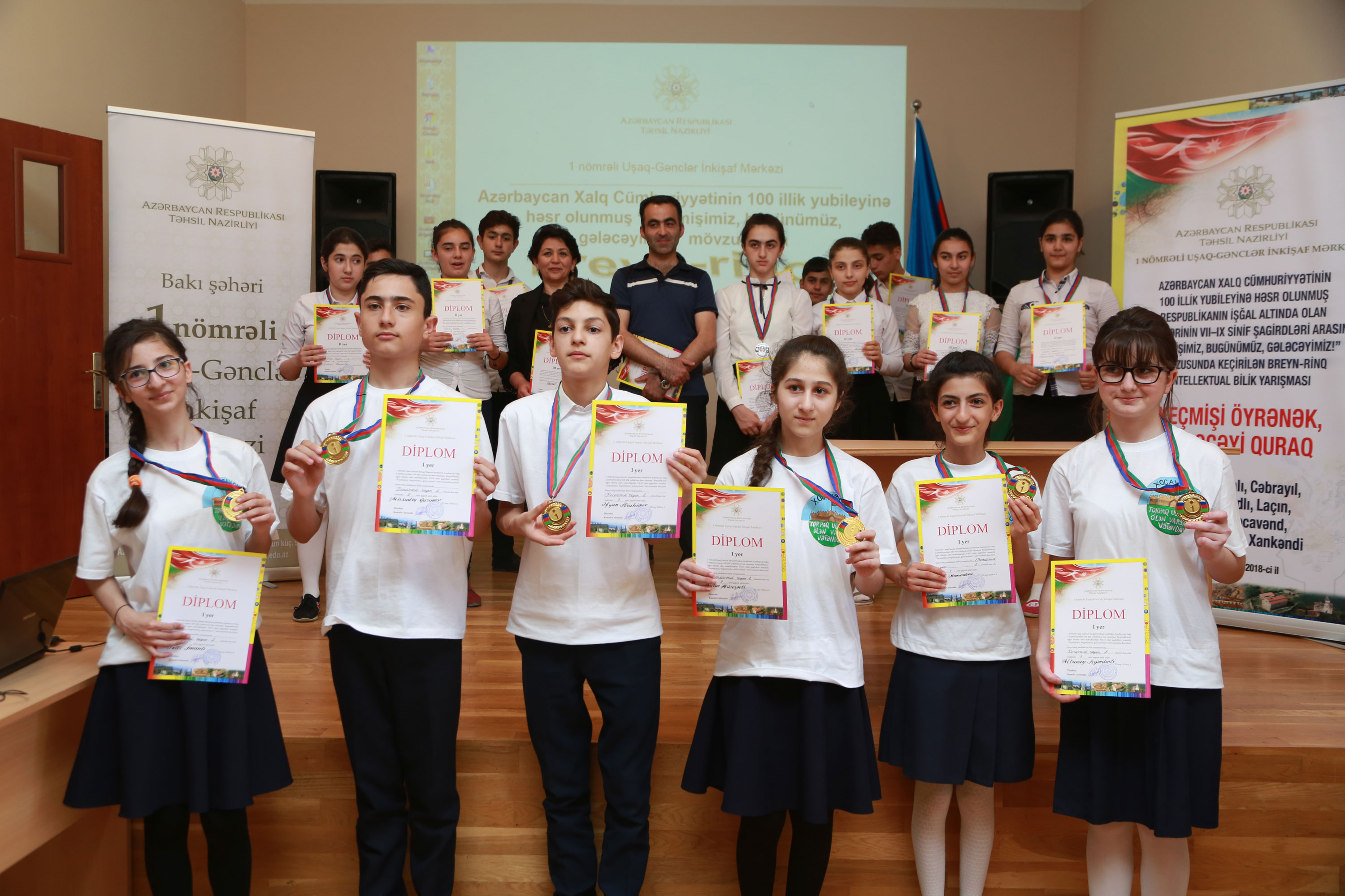 Təhsil Nazirliyinin tabeliyində fəaliyyət göstərən 1 nömrəli Uşaq-Gənclər İnkişaf Mərkəzində Azərbaycan Xalq Cümhuriyyətinin 100 illik yubileyinə həsr olunmuş “Keçmişimiz, bugünümüz, gələcəyimiz!” mövzusunda intellektual bilik yarışmasının üçüncü – final mərhələsi keçirilib. Bilik yarışmasında məcburi köçkün rayonlarının Bakıda yerləşən ümumi təhsil müəssisələrinin məktəbliləri iştirak edib.