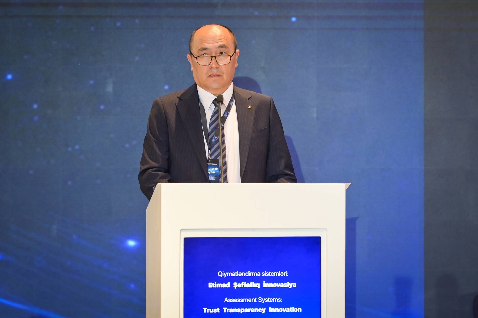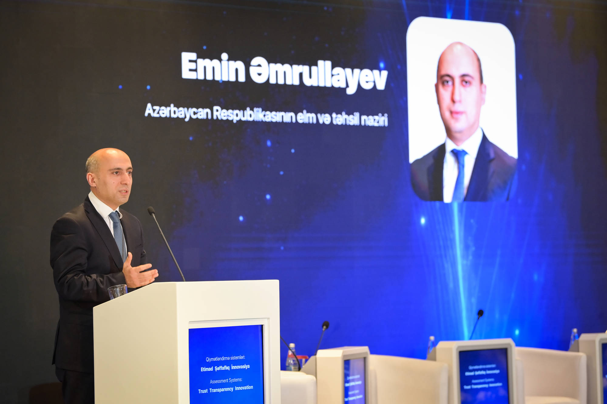 Daha sonra çıxış edən elm və təhsil naziri Emin Əmrullayev Bakıda qiymətləndirmə sahəsində bu cür beynəlxalq tədbirin təşkilinin əhəmiyyətini vurğulayıb və ölkəmizdəki mərkəzləşdirilmiş imtahan modelinin şəffaflıq və iştirakçılar arasında rəqabət yaratması baxımından həlledici rolunu qeyd edib. Emin Əmrullayev konfransın təhsilin qiymətləndirilməsi sahəsində ən yaxşı təcrübələri bölüşmək və qarşıya çıxan ümumi problemləri müzakirə etmək üçün əlverişli platforma olacağına inandığını bildirib. Nazir qeyd edib ki, Dövlət İmtahan Mərkəzi vətəndaşlar haqqında ən geniş informasiyaya malik bir qurumdur və bu gün konfransda əyləşənlərin çoxu vaxtı ilə Tələbə Qəbulu üzrə Dövlət Komissiyasının və ya Dövlət İmtahan Mərkəzinin imtahanlarından keçən şəxslərdir. Nazirin sözlərinə görə, Azərbaycan xalqı və dövləti qarşısında ədalətli imtahanların təşkili əldə olunmuş uğurlardan biridir. Qeyd edilməlidir ki, DİM tərəfindən keçirilən imtahanlar təkcə ali və orta ixtisas müəssisələrinə qəbul funksiyası daşımır. Həmin imtahanların nəticələri müəyyən təhlillər aparmaq və buna uyğun olaraq strateji qərarlar qəbul etməyə imkan yaradır.