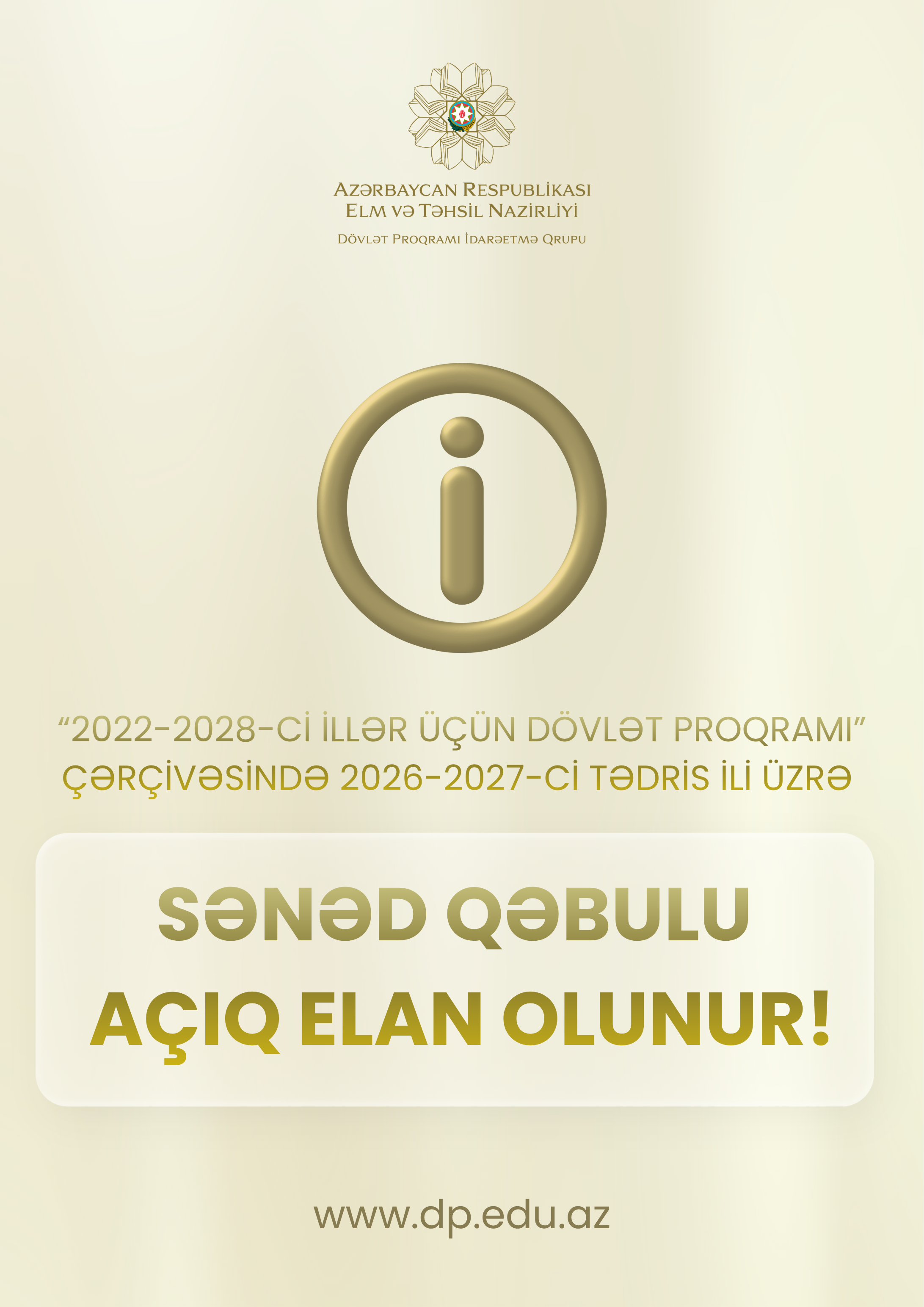 "Gənclərin xarici ölkələrin nüfuzlu ali təhsil müəssisələrində təhsil almalarına dair 2022-2028-ci illər üçün Dövlət Proqramı" çərçivəsində 2026/2027-ci tədris ili üçün dünyanın nüfuzlu universitetlərinin bakalavriat, magistratura və doktorantura səviyyələri üzrə sənəd qəbulu 15 aprel 2026-cı il tarixindən açıq elan olunur. Sənəd qəbulu üçün son tarix 5 iyun 2026-cı il saat 18:00-dır.